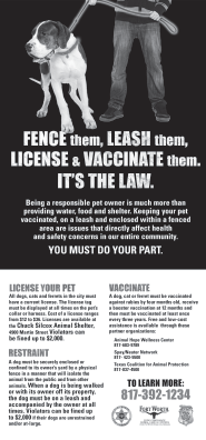 The “Fence Them In – It’s the Law” educational campaign was developed to address a number of issues facing the city of Fort Worth with regards to stray animals.