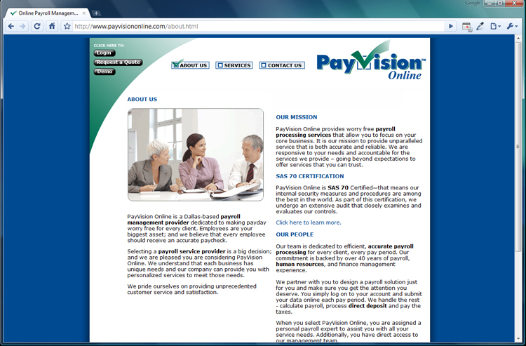 PayVision Online is a Dallas-based payroll management provider dedicated to making payday worry free for every client. They provide an easy to use tool for tracking employees and their time, managing complicated schedules, equitably distributing overtime, while reducing the amount of time spent on administrative tasks. Backed by over 40 years of payroll, human resources, and finance management experience, PayVision Online offers efficient, accurate payroll processing for every client — every pay period.